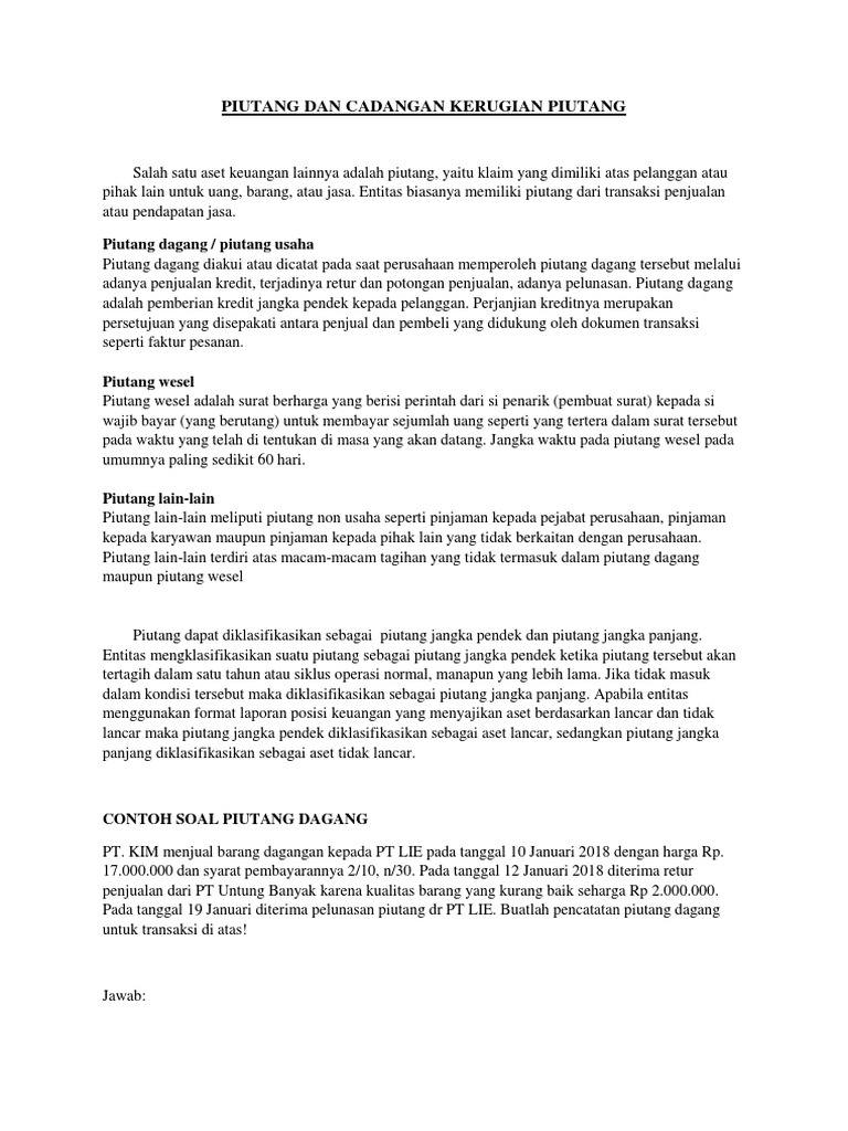Contoh Soal Pilihan Gnda Tentang Utang Piutang Dalam Materi Fiqih Jawabanku Id from data03.123dok.com Contoh soal pilihan ganda materi fakta dan opini this mommas. Semoga soal pilihan ganda piutang dan jawabannya diatas bisa bermanfaat buat. Setelah mengetahui tentang penyisihan piutang tak tertagih sesuai ciri ciri akuntansi piutang akan mempermudah para pembaca untuk memahami tentang berbagai ketentuan tentang piutang tak tertagih yang terdiri dari estimasi. Pada kali ini kami akan membagikan salah satu latihan soal yang kami miliki, yaitu latihan soal mapel akuntansi keuangan (khususnya kompetensi keahlian akuntansi dan keuangan lembaga). Berikut ini adalah beberapa soal piutang dagang dan pembahasannya / soal piutang dagang dan cadangan kerugian piutang rp9.720,00. Contoh soal akuntansi perusahaan dagang beserta jawabannya memudahkan para pemula untuk memahami tentang transaksi yang terjadi di perusahan dagang yang kegiatan utamanya menjual kembali barang. Contoh soal neraca skontro terlengkap beserta jawabannya. Dilihat dari fungsinya, akuntansi diartikan sebagai… a.