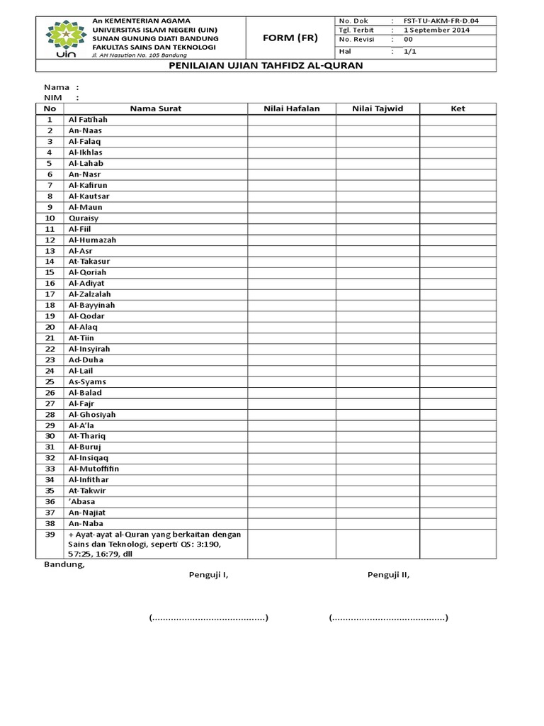 35 al bukhari muhammad ibn ismail 2001 mukhtasar. Form juri lomba adzan docx. Tapi memang apa saja sih yang menjadi keriterian penilaian dari lomba menghafal. Pedoman penskoran tahfiz quran : Jika santri mendapat nilai b maka dia dapat melanjutkan ke halaman berikutnya di jilid yang sama. Untuk paket dasar ada 6 kali evaluasi yaitu : See full list on agussiswoyo.com Baik (tartil, terputus, diingatkan guru dan benar) 6 : See full list on agussiswoyo.com Istimewa (seperti bacaan gurunya) 9 : Standard penilaian santri sebagaimana yang tercantum dalam kartu prestasi santri yaitu : Hafalan sangat lancar tanpa salah skor 4 : Dec 06, 2020 · format penilaian menulis al quran.