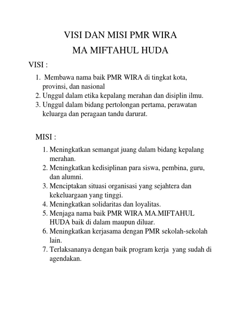 Visi Misi from mtsymiwonopringgo.sch.id Penyampaian visi dan misi oleh kandidat ketua unit organisasi pmr wira man 2 banyumas periode 2020/2021. Wujudnya lebih baik dari sekarang. Pengamatan, kemampuan untuk merasakan sesuatu yang tidak tampak melalui kehalusan jiwa dan ketajaman penglihatan, kemampuan untuk melihat pada inti persoalan, pandangan atau wawasan ke depan. Ada beberapa teknik dan evaluasi untuk menilai bagaimana visi dan misi tersebut sesuai dengan organisasi. Visi dan misi palang merah remaja tingkat wira. Jika visi hanya dituliskan dalam kalimat yang singkat, maka dari itu misi dijabarkan dengan beberapa kalimat yang mudah untuk dipahami pembaca atau siapa saja yang melihatnya. Kemudian, dari segi tulisan visi biasa ditulis sangat singkat dan hanya dalam satu kalimat saja. Pencetakan dan penerbitan visi, misi dan tujuan sekolah.
